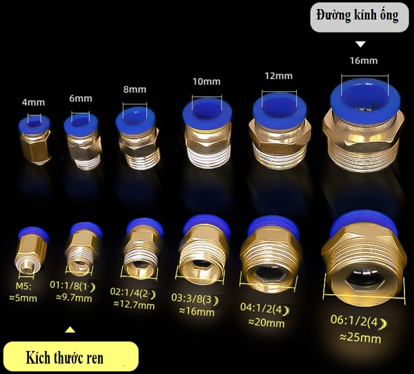 - Kích thước ren: Chọn kích thước ren ngoài phù hợp với ren trong của thiết bị hoặc ống dẫn khí.