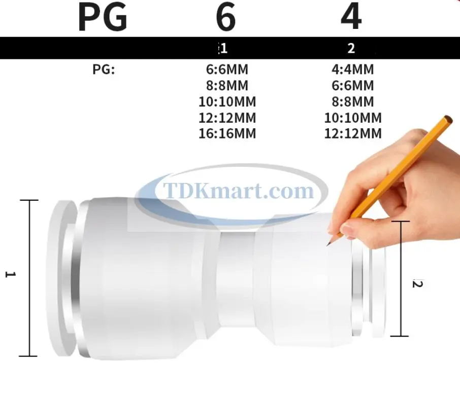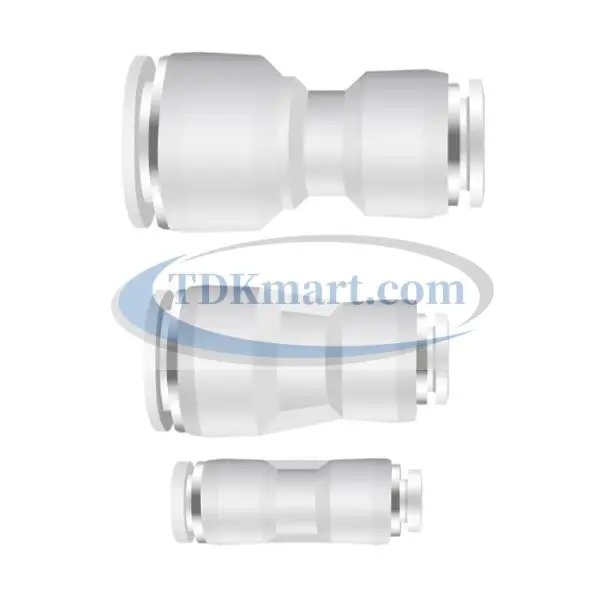 Đầu nối nhanh khí nén thẳng giảm màu trắng có 2 đầu ghim ống là loại phụ kiện dùng để nối trực tiếp hai đoạn ống khí nén có đường kính khác nhau, giúp dẫn khí ổn định giữa hai kích thước ống khác nhau mà không cần ren hoặc keo dán.