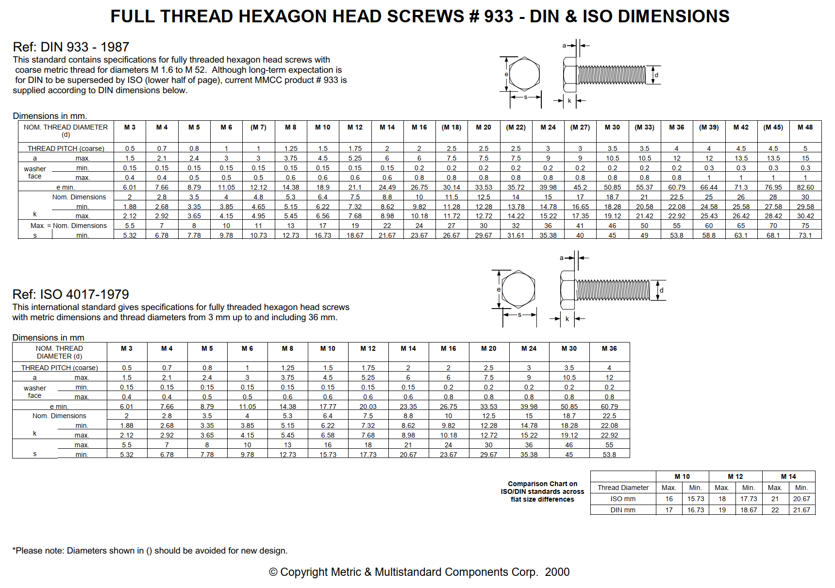 Bu lông tiêu chuẩn DIN 933 cấp bền 4.8, 8.8, 10.9. Đường kính từ M5 đến M42 chiều dài đến 300mm, lớp phủ bề mặt: Mộc, nhuộm đen, mạ điện phân hoặc mạ kẽm nhúng nóng.