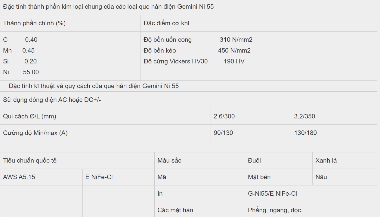 Que hàn có hỗn hợp 55% niken nguyên tố được thiết kế đặc biệt. Dùng để hàn gang và gang, công suất thấp, có thể hàn không cần sinh nhiệt. Chất hàn có thể được gia công bằng dây Gemini Ni 55 là hỗn hợp được thiết kế đặc biệt của sắt nguyên tố, niken, dây 55%. Dùng để hàn các lĩnh vực gang và than chì yêu cầu độ bền cao. Loại dây hàn này sử dụng ít điện năng hơn. Nó có thể được hàn mà không cần nhiệt. Dòng hàn có thể được gia công.